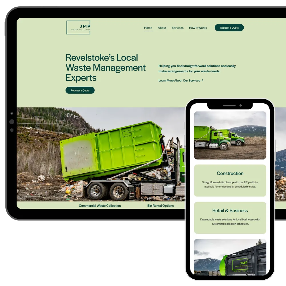 All website copy was written by Annie, our in-house Revelstoke copywriter, with a focus on reliably and professionalism. The project delivers a straightforward, professional online presence that supports local visibility, builds confidence with prospective clients, and positions JMP Waste Solutions as a dependable service provider in Revelstoke.