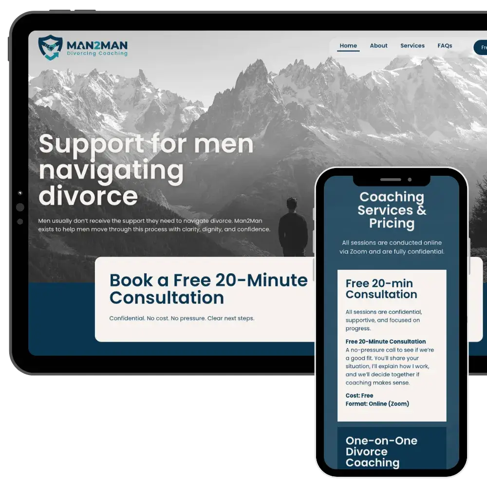 Man2Man Divorce Coaching provides practical, one-on-one support for men navigating separation and divorce. Focused on clarity, accountability, and forward momentum, the coaching service helps clients make confident decisions and move through a challenging life transition with structure and support.